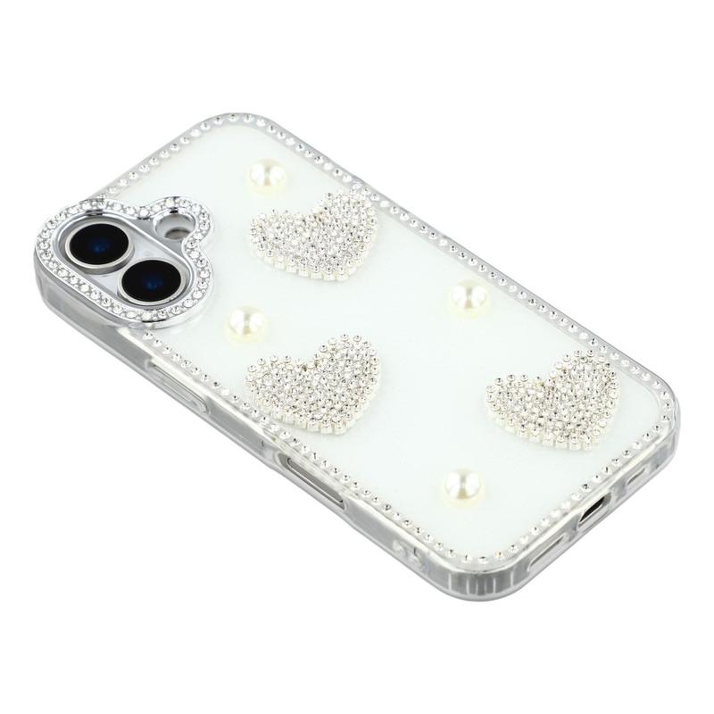 This iPhone 16 case combines reliable everyday protection with glamorous style. Featuring shimmering rhinestones around the edges and sparkling pearl heart decorations on the back, it turns your iPhone 16 into a fashionable accessory while keeping it safe from scratches and bumps.