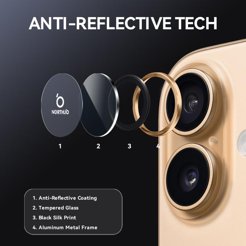 Upgrade your iPhone 17 with the Northjo camera lens protector. Featuring a CD veins aluminum ring, it adds a sleek, modern touch to your iPhone 17 while offering robust protection. The 9H tempered glass safeguards against scratches, impacts, and dust, ensuring your camera lens stays crystal clear. With easy, tool-free installation, you can enhance your iPhone 17 durability and aesthetics in seconds.