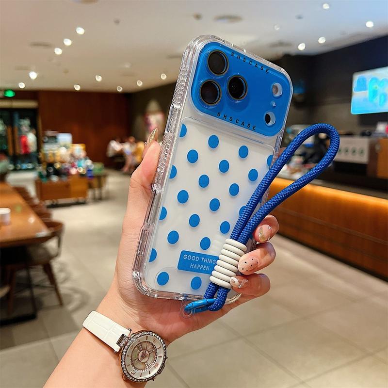- Specifications – Material: TPU + PC | Compatibility: iPhone 17 Pro Max | Style: Transparent with polka dots | Accessories: Case + Lens Film + Strap.