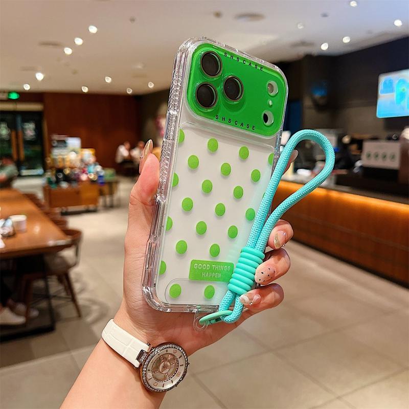 - Specifications – Material: TPU + PC | Compatibility: iPhone 17 Pro Max | Style: Transparent with polka dots | Accessories: Case + Lens Film + Strap.