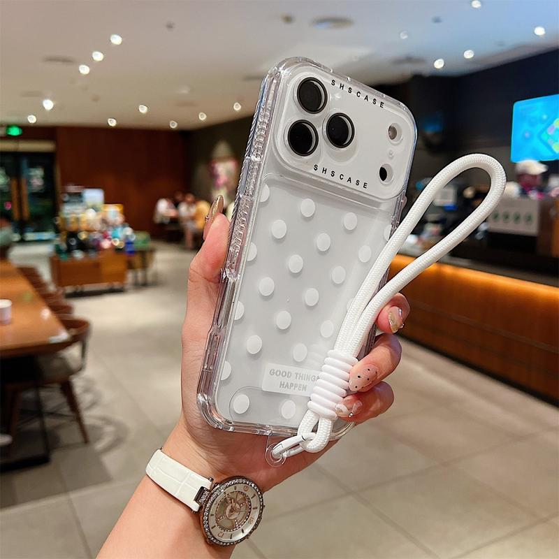 - Specifications – Material: TPU + PC | Compatibility: iPhone 17 Pro | Style: Transparent with polka dots | Accessories: Case + Lens Film + Strap.