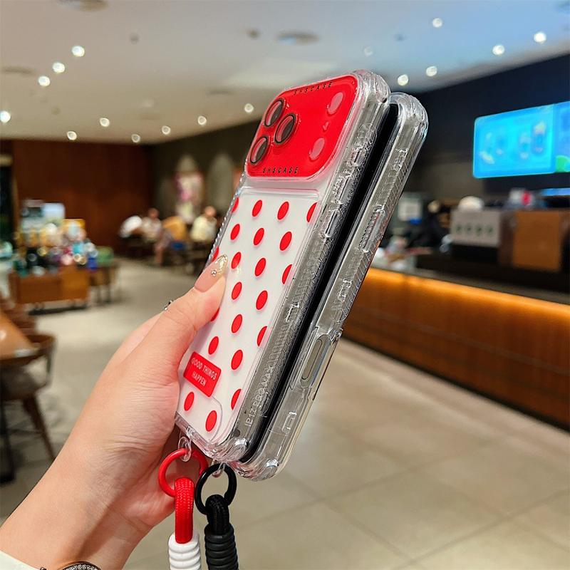 - Specifications – Material: TPU + PC | Compatibility: iPhone 17 Pro | Style: Transparent with polka dots | Accessories: Case + Lens Film + Strap.