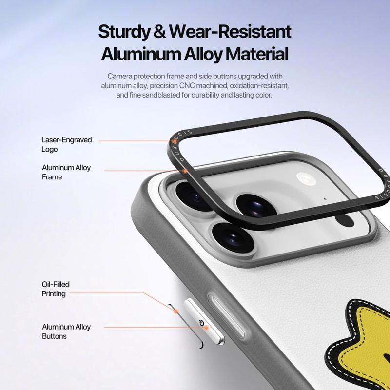 The camera protection frame and side buttons are made from aluminum alloy, precisely CNC-machined and finished with fine sandblasting. This ensures long-lasting colour, durability and a premium feel, enhanced with subtle laser-engraved details.