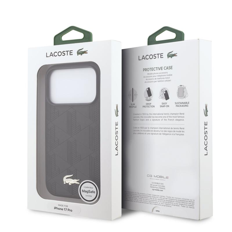 The Lacoste Monogramme Gold Logo MagSafe Case for iPhone 17 Pro is a premium cover made to protect your phone while adding a refined, fashion-forward finish. Crafted from lightweight yet durable polyurethane (PU) with an elegant Monogramme pattern, it feels secure in the hand and helps reduce the risk of slipping. With a precise fit, easy access to buttons and ports, and full MagSafe support for wireless charging and accessories, it’s designed for everyday comfort with a luxurious look.