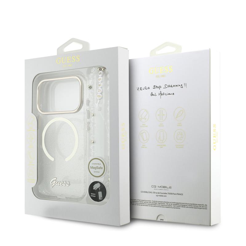 Guess IML Glitter Script Strap MagSafe Case for iPhone 17 Pro Max - Glitter Back Cover with Wrist Strap, PC+TPU Protection, MagSafe Compatible