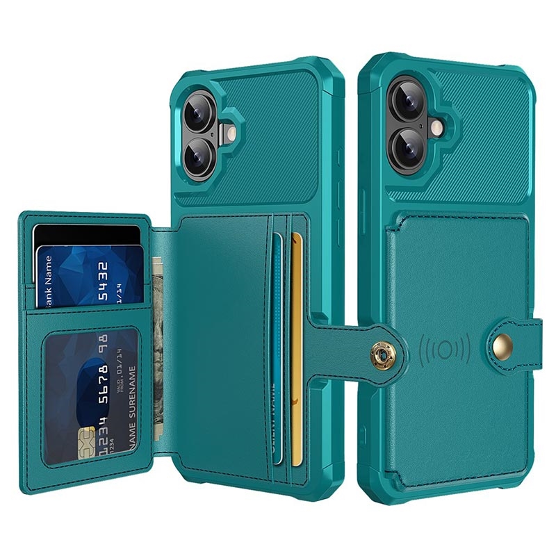 - iPhone 17 wallet case has a secure snap button closure, wallet design, and several card slots with a cash pocket