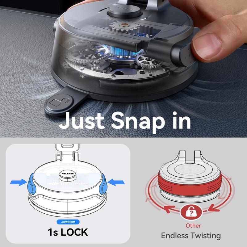 The JOYROOM JR-ZS510 foldable magnetic car phone holder is built for drivers who want a fast, stable, and secure mount without constant readjustments. It uses 22 N55 high-performance magnets for a strong magnetic hold that stays steady on bumpy roads, while the reusable gel suction cup grips firmly to smooth surfaces like dashboards and windshields. Installation is quick and frustration-free thanks to the 1-second snap-in lock mechanism, which secures the suction base instantly without endless twisting. Dual metal support arms improve stability, and a durable metal pivot joint is designed to keep smooth damping performance even after repeated rotations.