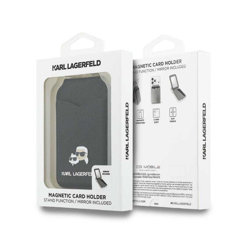 Upgrade your phone with a premium accessory that s as practical as it is stylish: the Karl Lagerfeld Mirror magnetic card holder with stand function. This MagSafe wallet attaches securely to compatible phones and cases, keeping your essential cards close while maintaining a sleek everyday carry. The clever fold-out design turns into a hands-free stand, perfect for watching videos, scrolling, or taking video calls without holding your phone. Inside, you ll find an elegantly hidden mirror—ideal for quick touch-ups anytime. Finished with Karl Lagerfeld s signature branding and the iconic Choupette detail, it brings luxury fashion to your daily routine.