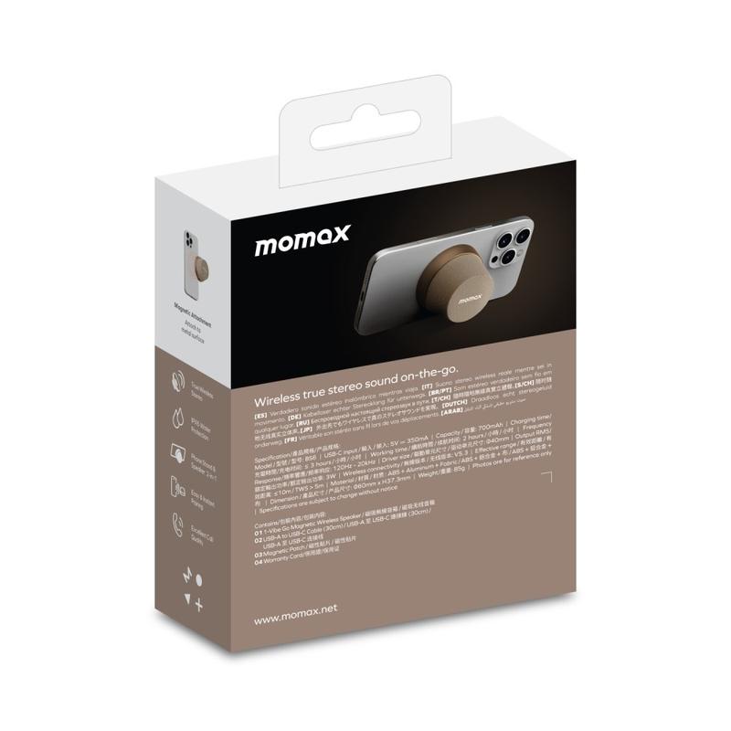 The MOMAX 1-Vibe Go BS6 magnetic mini Bluetooth speaker is a compact, versatile audio solution designed for everyday entertainment at home or on the go. Its ultra-mini magnetic design combines a portable wireless speaker with a practical phone stand, letting you enjoy music, videos, and calls with ease. Equipped with a powerful 40 mm driver and 360° sound output, it delivers immersive audio in a surprisingly small form, while IPX6 water resistance makes it suitable for daily use in different environments.