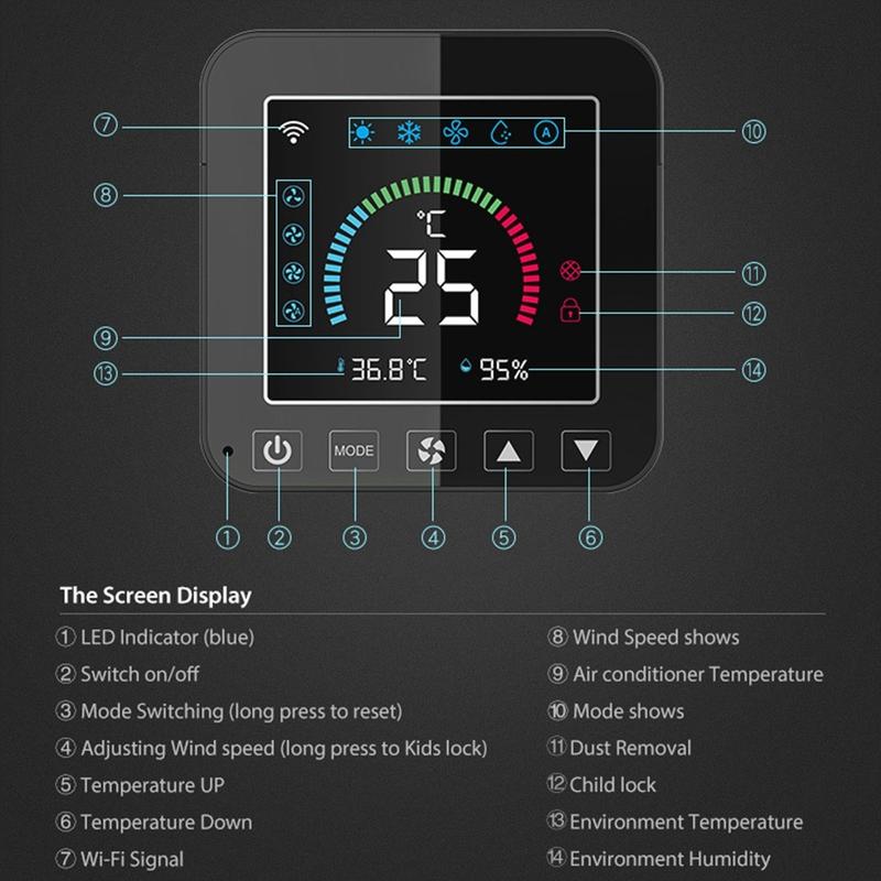 This smart air conditioner controller helps turn a standard air conditioner into a more flexible and convenient system. It can improve everyday comfort by giving you better awareness of room conditions and more control over how your cooling system works. Thanks to its compact size, practical display, and infrared control, it is a useful addition for anyone who wants a smarter indoor climate setup without replacing the air conditioner itself.