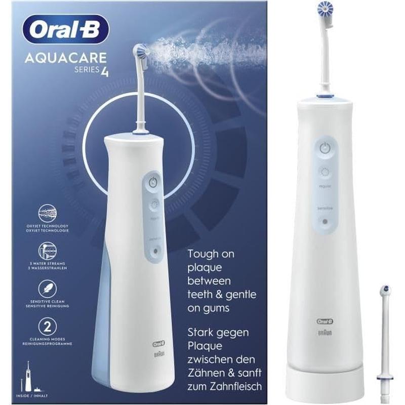 The Oral-B AquaCare 4 is a cordless oral irrigator designed to support deeper everyday cleaning and fresher oral hygiene alongside regular tooth brushing. Featuring Oxyjet Technology, it enriches water with microbubbles to help clean more effectively along the gumline and between teeth, making it a practical choice for users who want a gentler and more precise cleaning routine.