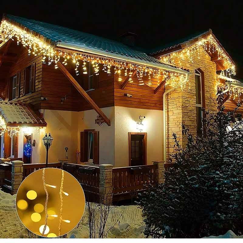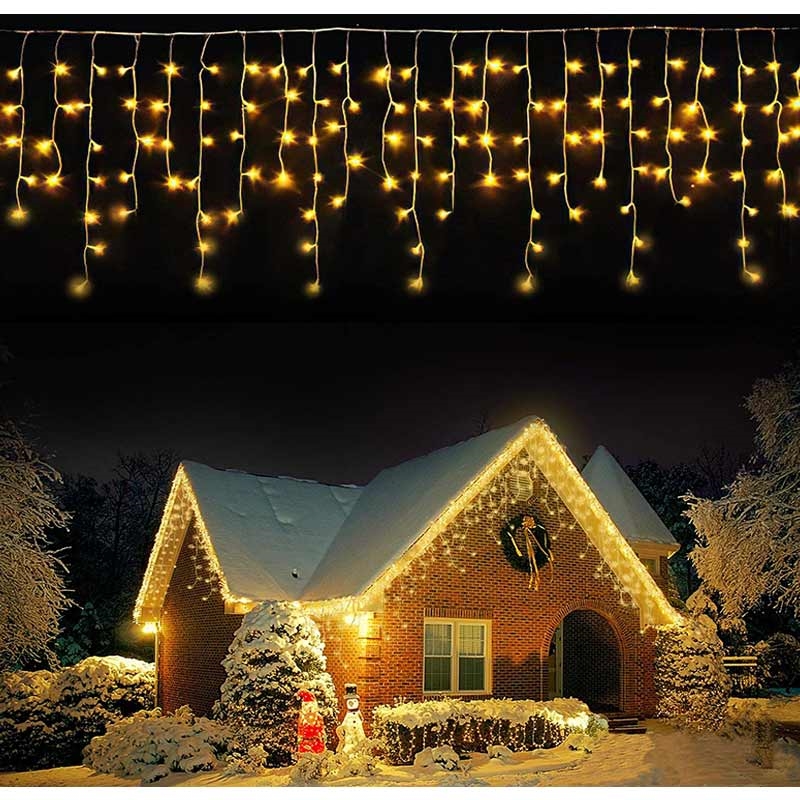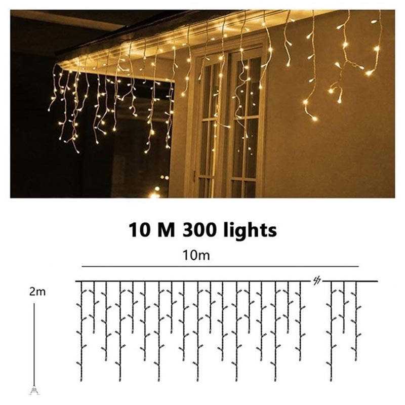 - Waterfall curtain design with 300 warm white LEDs for a soft, inviting glow