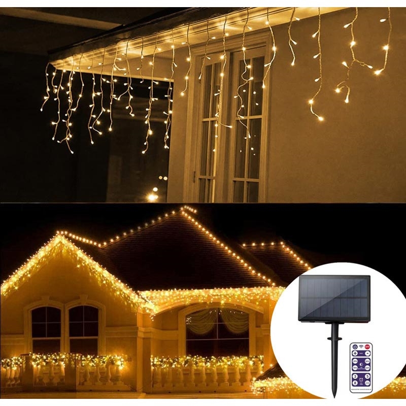 • Solar Curtain String Lights 10m - 300 LED Waterfall Fairy Lights with Remote, IP55