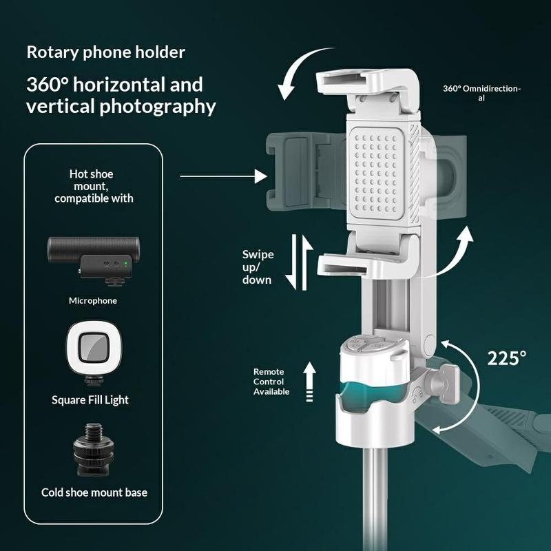 The phone clamp supports 360° rotation for portrait or landscape shooting and offers 225° tilt adjustment. This flexibility allows you to capture creative angles for vlogs, group photos and social media content.