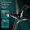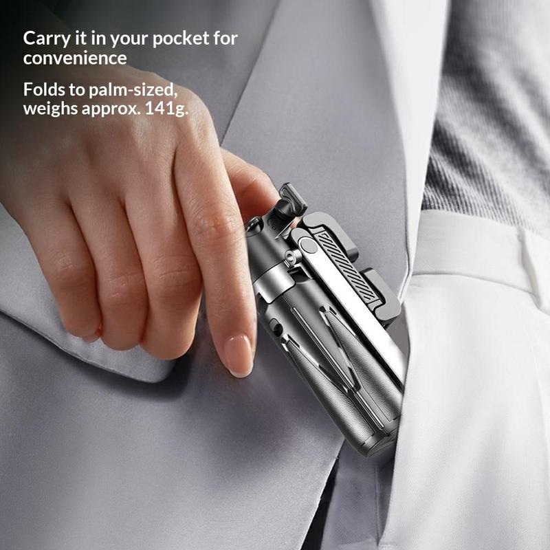 The four-leg tripod design with aluminium alloy support structure provides reliable stability on flat surfaces. A one-touch pop-up mechanism allows quick setup, making it easy to switch between handheld and desktop use.