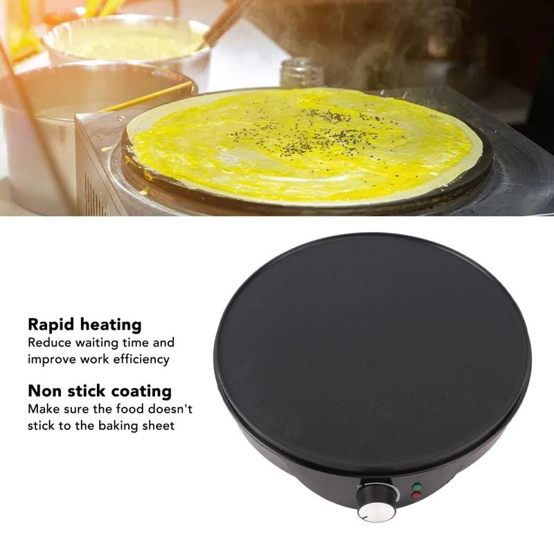 Create perfectly thin, evenly cooked crepes at home or in professional kitchens with this 12-Inch Electric Crepe Making Machine. Featuring a wide non-stick aluminum cooking plate and smart temperature control, it ensures uniform heating for consistent results every time. The fast-heating 1000W design saves both time and energy, allowing you to prepare crepes, pancakes, flatbreads and a variety of thin pastries with ease. Its BPA-free construction, simple operation and easy-to-clean surface make it a practical and user-friendly addition to any kitchen.