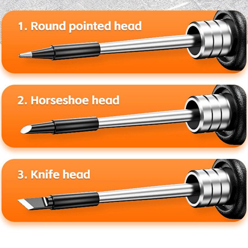 - Includes three interchangeable tips: round pointed, horseshoe, and knife