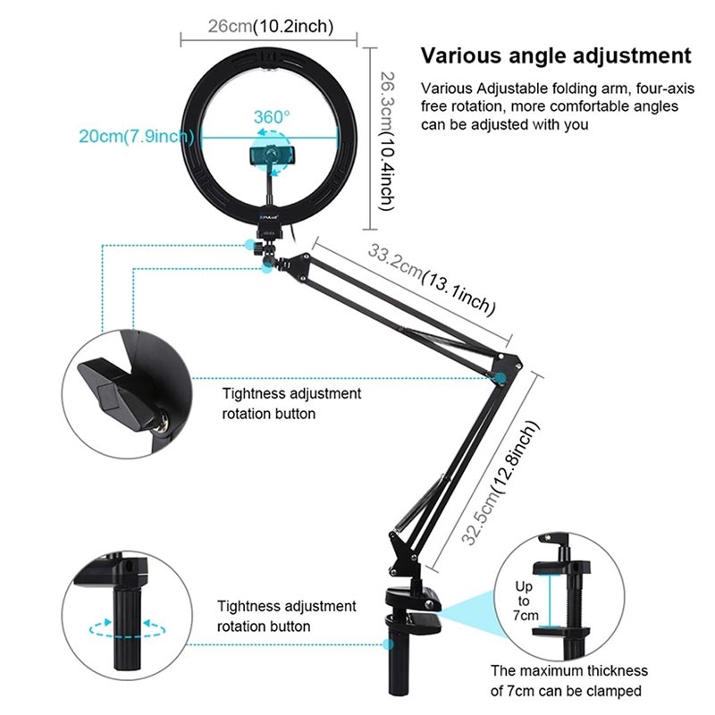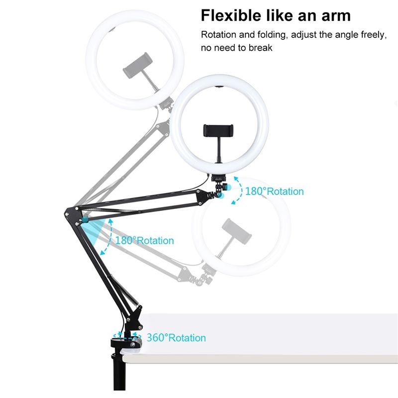 LED ring light can be mounted on the holder and take it anywhere, it can also be removed from the stand at any time, the tripod ball head can 360 degree rotating can free to adjust to any angle (The holder is not included)