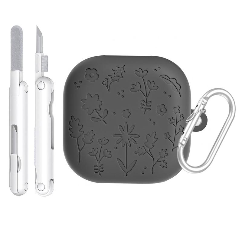 Samsung Galaxy Buds4/Buds4 Pro Floral Engraved Silicone Case with Cleaning Pens - Dark Grey