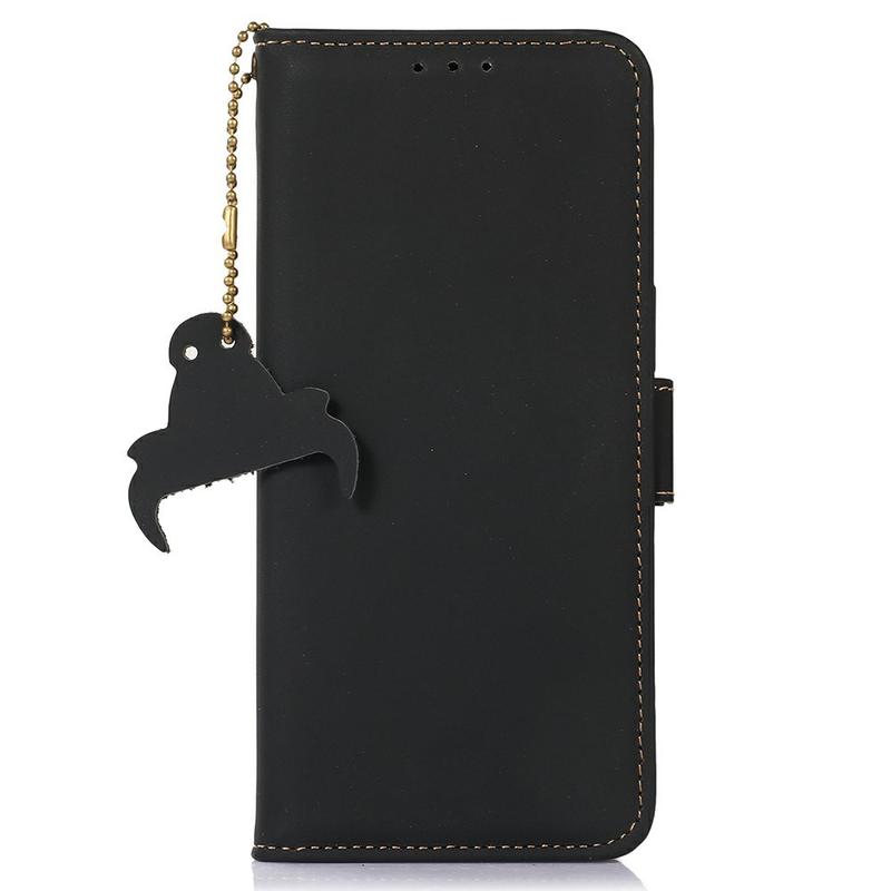 - Features: RFID-blocking, card slots, cash pocket, stand function, dual magnetic closure, detachable wrist strap