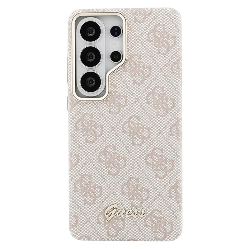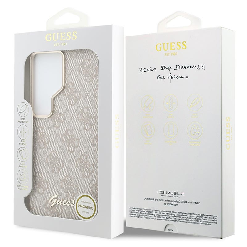 Give your Samsung Galaxy S26 Ultra a premium fashion look with the Guess PU 4G Script Metal Logo Magnetic Case. The signature 4G pattern and gold-tone Guess metal logo create an elegant, high-end finish, while the lightweight PC construction with polyutethane coating delivers everyday protection and a comfortable, secure grip. An integrated magnet makes it easy to use with magnetic phone holders without adding bulk.
