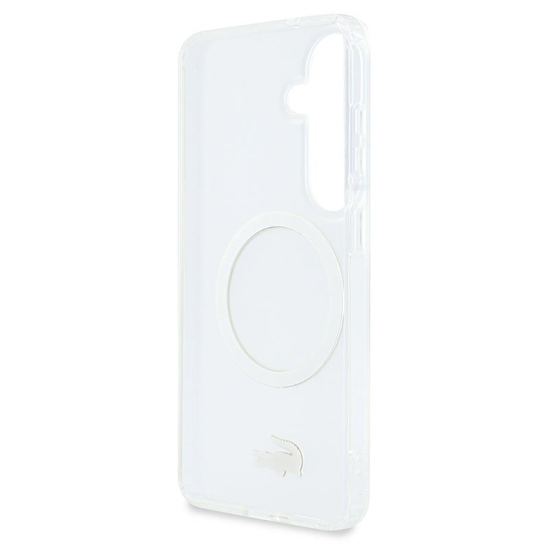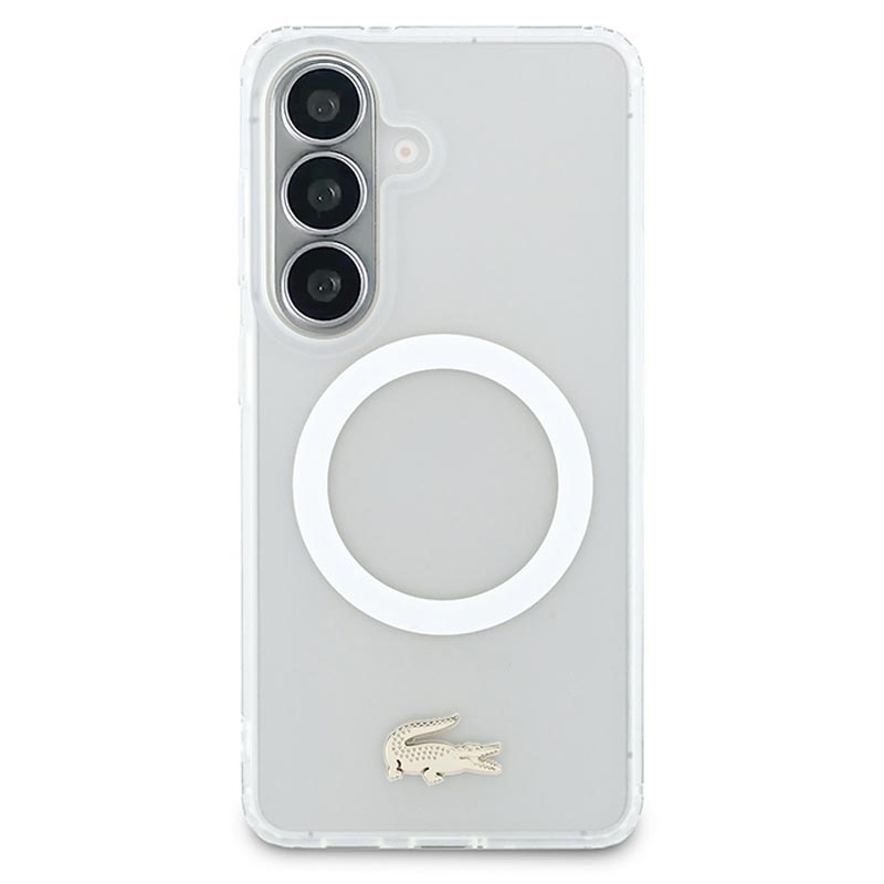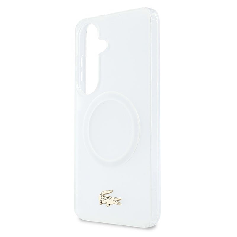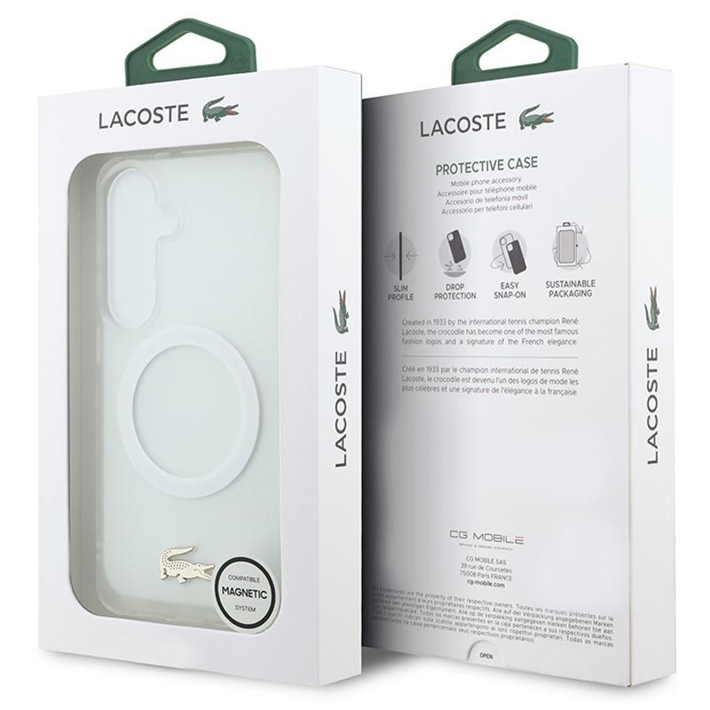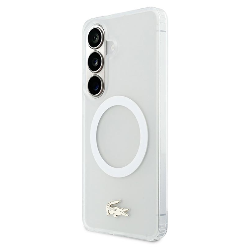 Protect your Samsung Galaxy S26 in style with the Lacoste Frosted Finish Gold Logo MagSafe Case. Crafted from a durable mix of polycarbonate (PC) and flexible TPU, this case ensures reliable everyday protection while maintaining a sleek, slim profile. The matte frosted finish highlights the iconic gold crocodile logo and elegant gold camera frame, adding a luxurious touch to your device. With MagSafe compatibility, it supports wireless charging and accessories without compromise.