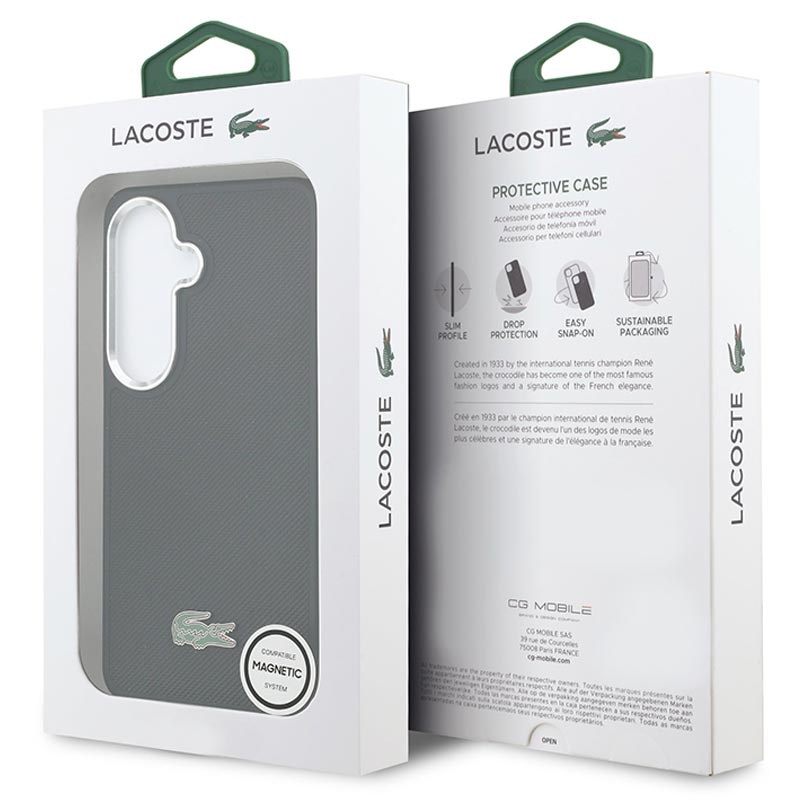 The Lacoste Iconic Petit Pique MagSafe case for Samsung Galaxy S26 combines timeless Lacoste design with practical everyday protection. Made from lightweight, durable PVC with a soft-touch finish and a microfiber-lined interior, it offers a secure grip and comfortable handling while helping protect your phone from daily wear. Full MagSafe compatibility ensures effortless wireless charging and seamless use with magnetic accessories, all wrapped in a clean, elegant look highlighted by the iconic metal crocodile logo.