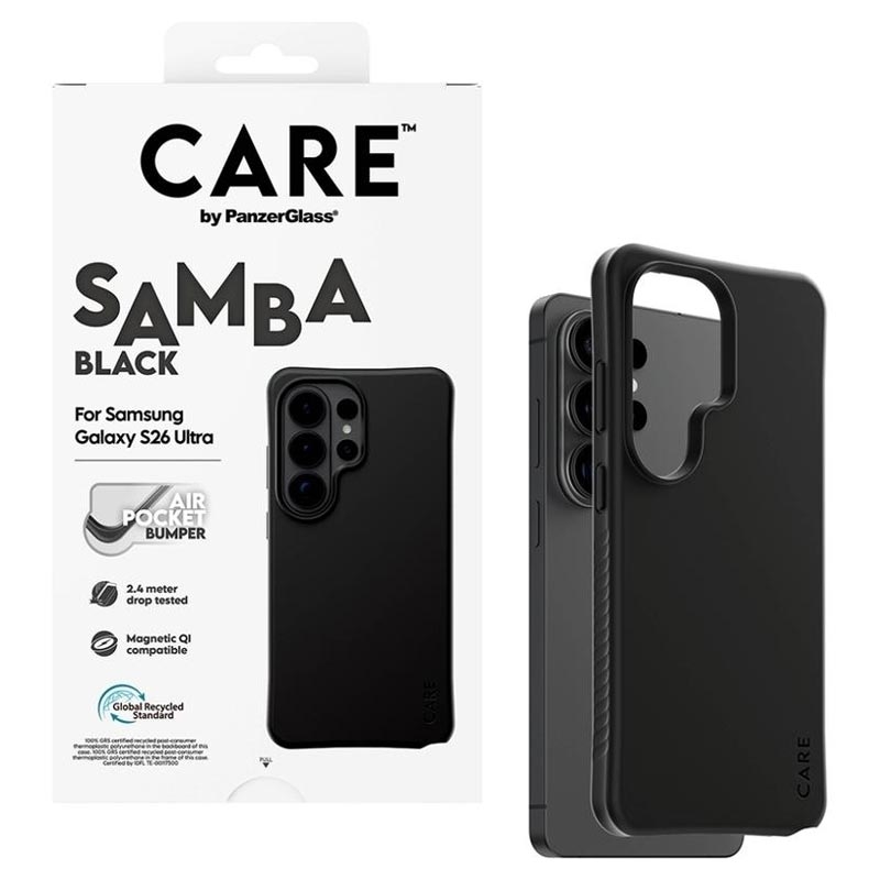 Give your Samsung Galaxy S26 Ultra a stylish upgrade while keeping it protected day after day. The CARE by PanzerGlass Qi Samba Case is made from 100% recycled TPU and designed to handle everyday bumps, drops, and scratches without sacrificing comfort. Enhanced corner protection helps absorb impact, while the smooth-grip finish feels great in hand and makes the Samsung Galaxy S26 Ultra easier to hold securely.