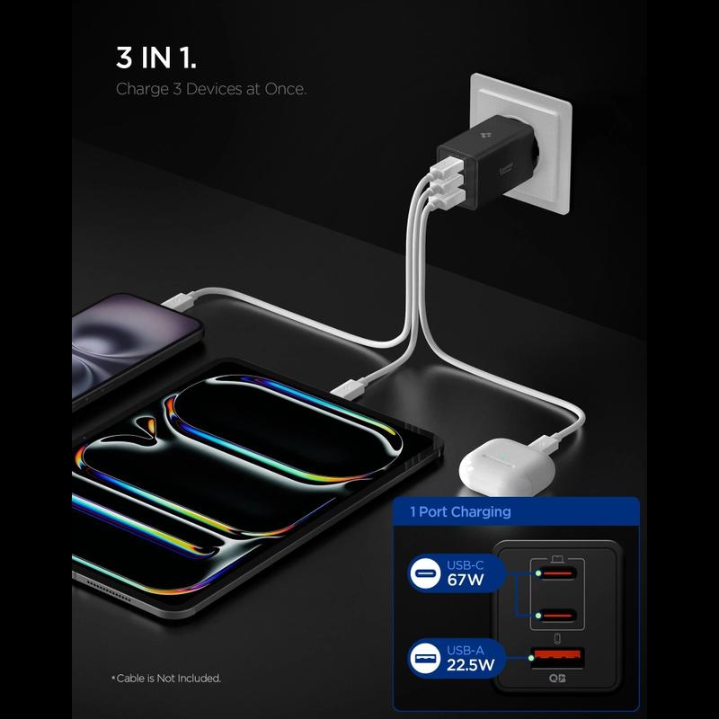 • Spigen Essential EE673EU 3-Port Wall Charger - 67W GaN Pro Fast Charger with Dual USB-C & USB-A