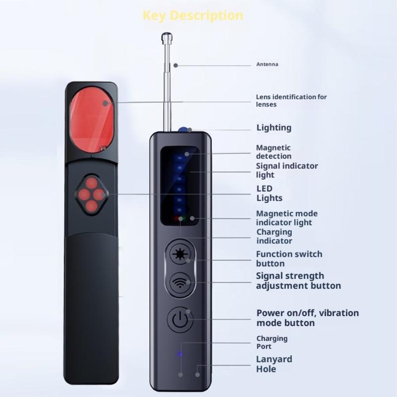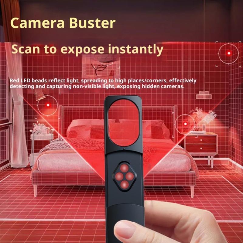 The built-in LED infrared scanner exposes hidden camera lenses, even if powered off or in covert mode—ideal for detecting pinhole cameras in mirrors, smoke detectors, air vents, clocks and other objects.
