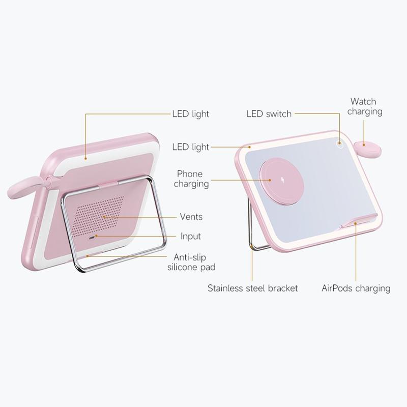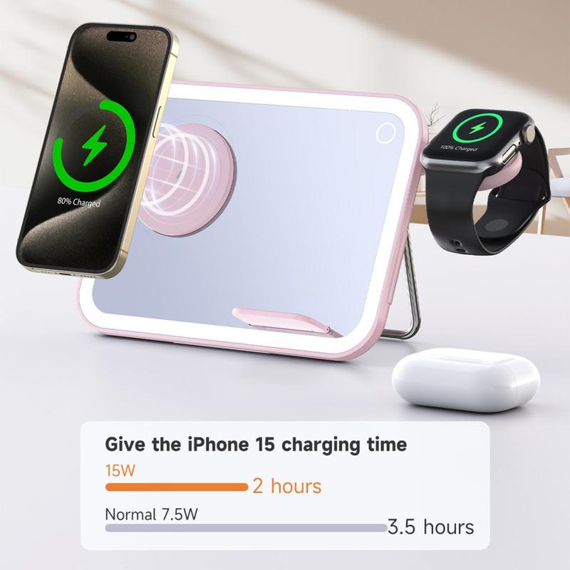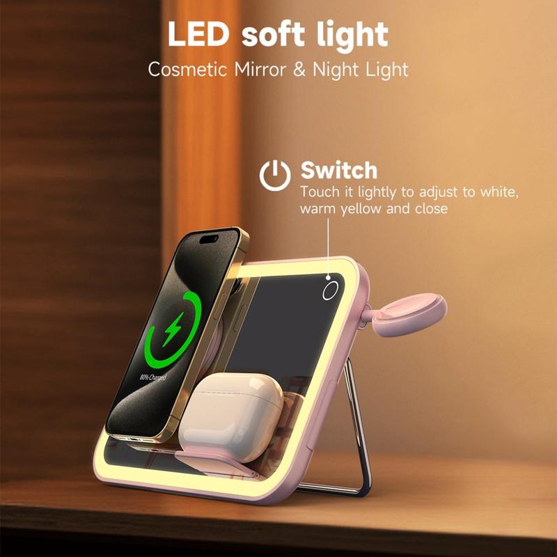 - 3-in-1 Functionality: Wireless charger, LED makeup mirror, and night light.