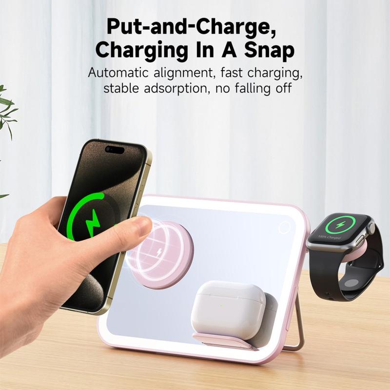 The V22 3-in-1 Wireless Charger combines a MagSafe-compatible charger, an LED makeup mirror, and a night light in one elegant device. This versatile gadget is designed to provide convenience and functionality in your daily routine.