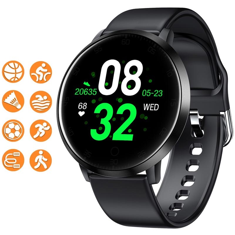 This waterproof smartwatch K12 tracks and informs you about your daily activities, sleeping quality, calls, SMS, and social media notifications. The K12 smartwatch allows you to check blood pressure, heart rate, and blood oxygen. The smartwatch K12 features eight motion modes: walk, run, swim, cycle, basketball, badminton, football, and rope skip.
