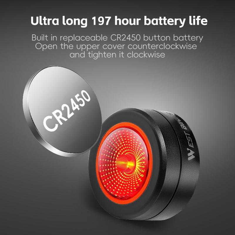 Increase your visibility and ride with confidence using the WEST BIKING smart bike tail light with magnetic brake sensing. Designed for seat bow mounting, this compact rear light features intelligent motion detection and automatic brake sensing to alert traffic behind you. Powered by a replaceable CR2450 battery, it offers up to 197 hours of operation, making it a reliable safety upgrade for daily commuting and night cycling.