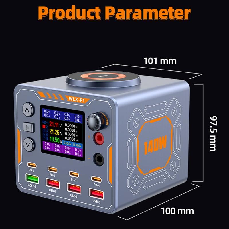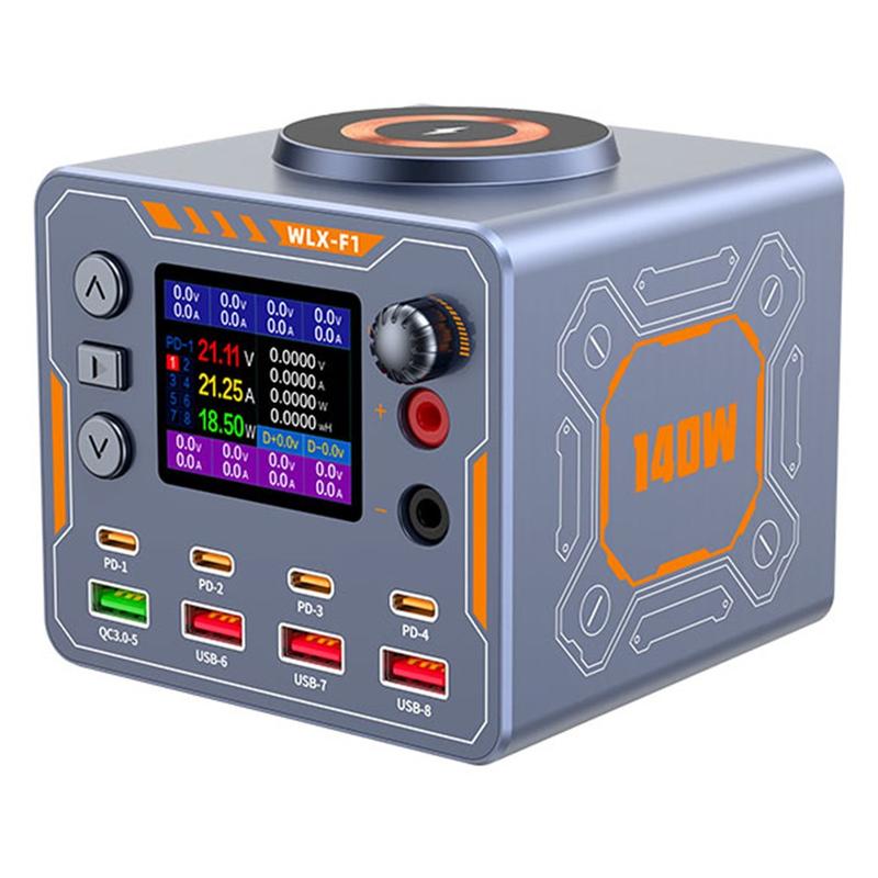 The amazing WLX-F1 140W multi-device charging station is a powerful and versatile desktop charger designed for laptops, phones, tablets, wearables and even electronics repair. Equipped with 8 charging options, including four PD fast-charging ports, one QC3.0 port, three USB ports and a 15W wireless charging pad, it delivers a complete charging solution for home, office or workshop environments.