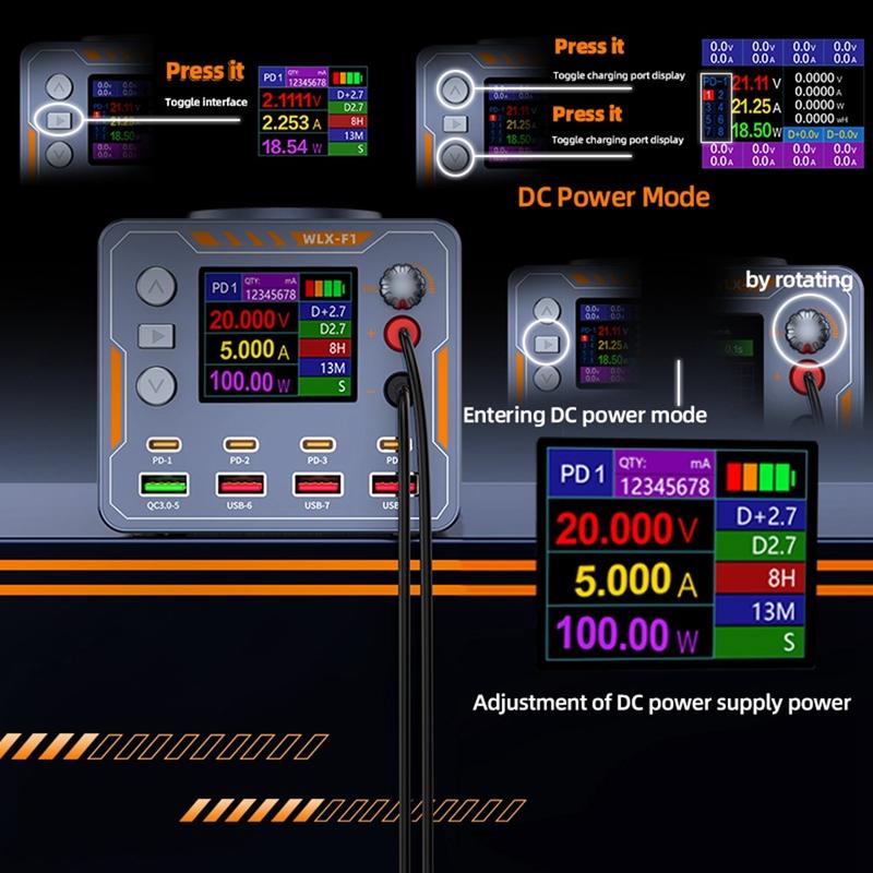 With up to 100W single-port output, the WLX-F1 efficiently powers high-demand devices such as MacBooks and USB-C laptops. It also features an adjustable precision DC output (1.8-12V, 2A), making it ideal for testing, repairing and diagnosing electronic equipment.