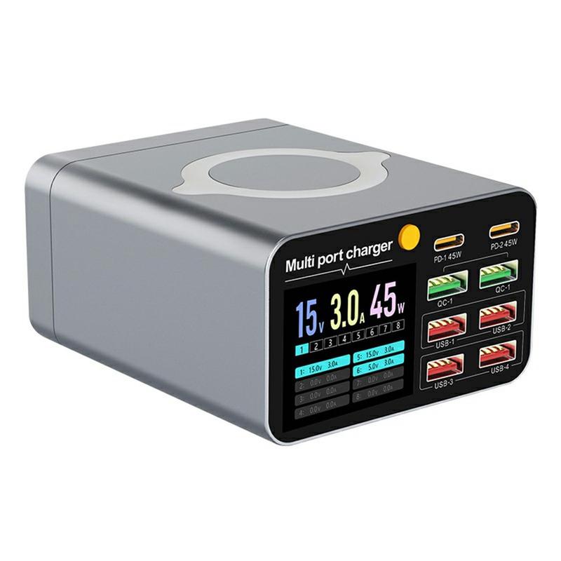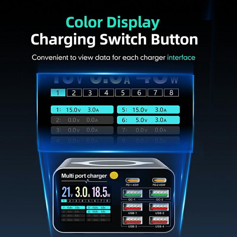 - 8-port design: 2 × USB-C PD, 2 × QC, 4 × USB