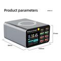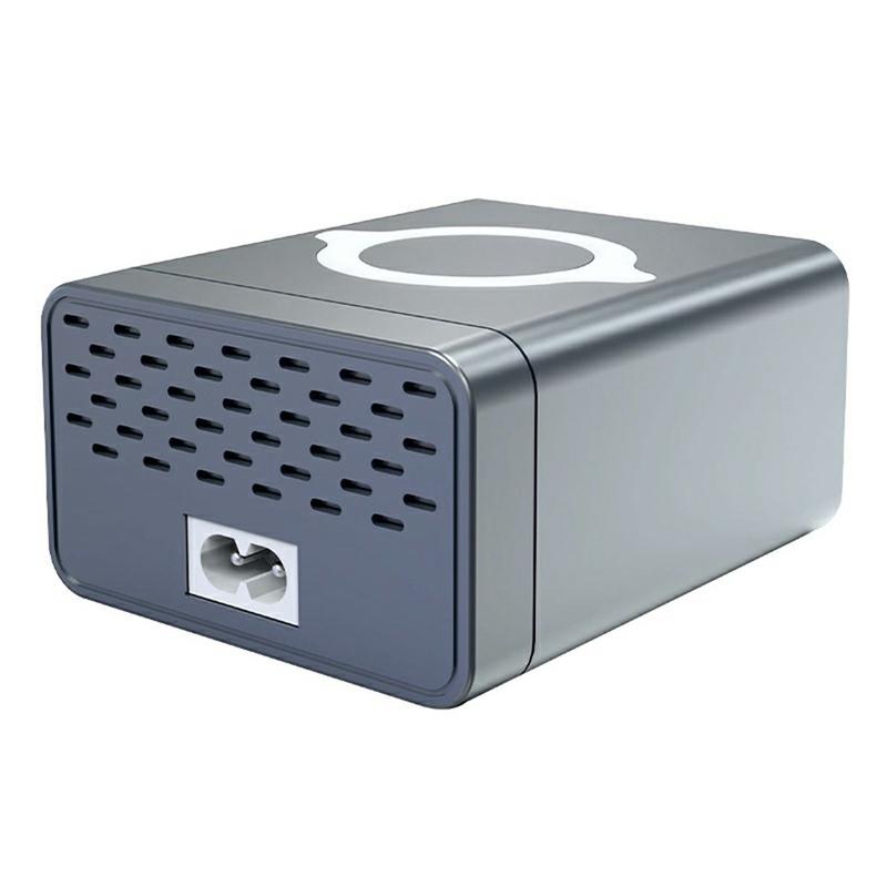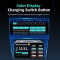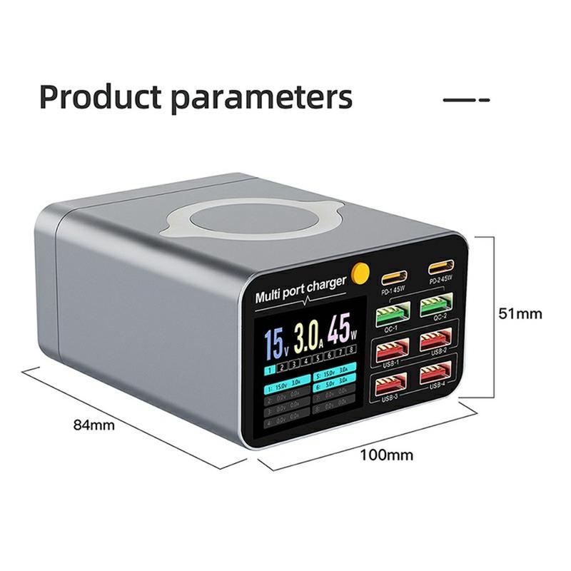 An integrated 5-15W wireless charging pad offers convenient cable-free charging for Qi-enabled smartphones and earbuds. The color display provides real-time charging information for each port, complemented by a physical power switch for quick control.