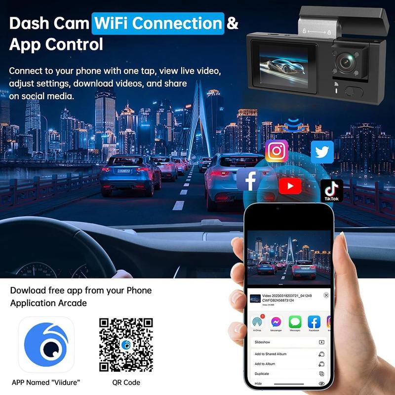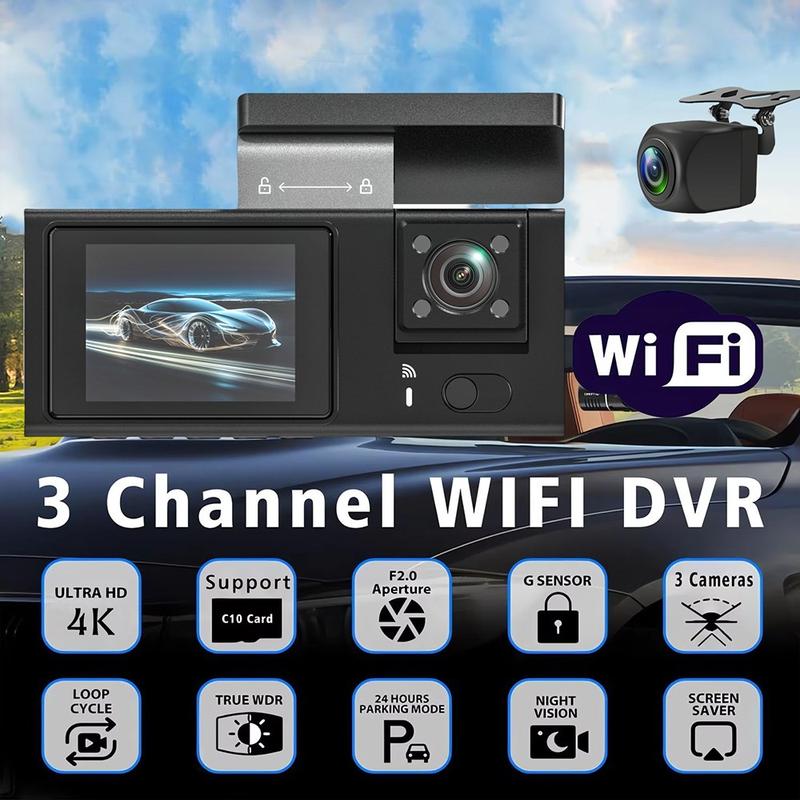 Y08 4K Triple-Lens Dash Cam - Front, Inside and Rear Car DVR with WiFi, 2" IPS Screen & G-Sensor
