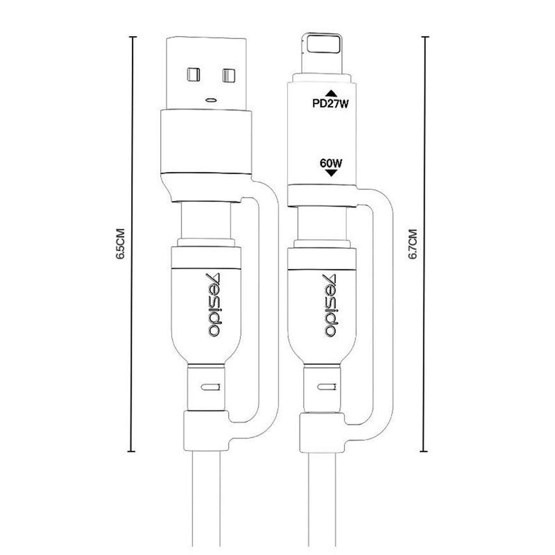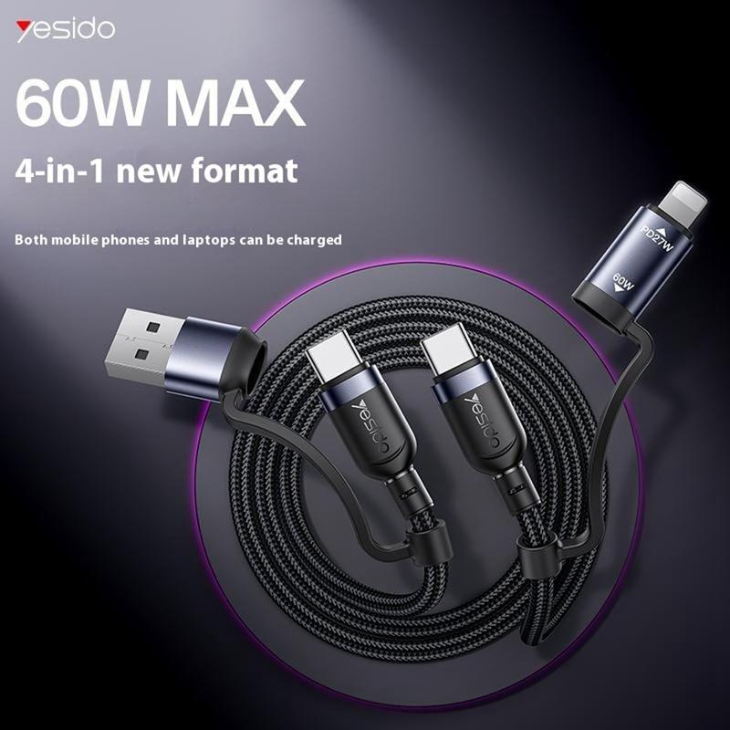 • Yesido CA200 4-in-1 Charging Cable - USB-A / USB-C to USB-C, Lightning (8-Pin) Braided Fast Charging Cable, Up to 60W, 1.2m
