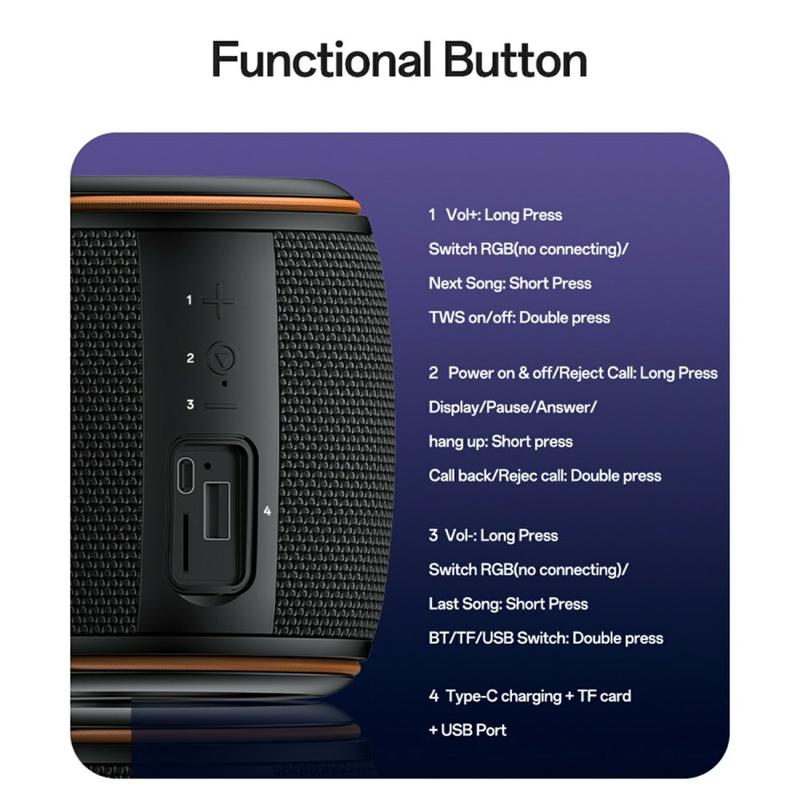 - Versatile Playback Options - Supports TF card, FM radio, USB, TWS pairing, AUX input, and Bluetooth.