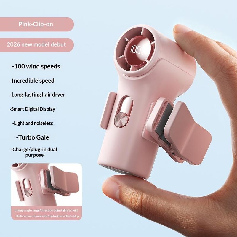 - Mini rechargeable fan for handheld, desktop, and clip-on use